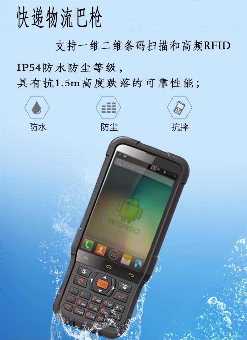 物流快遞巴槍優(yōu)勢 防跌落-IP54防護(hù)等級,具有1.5米高度跌落的可靠性;