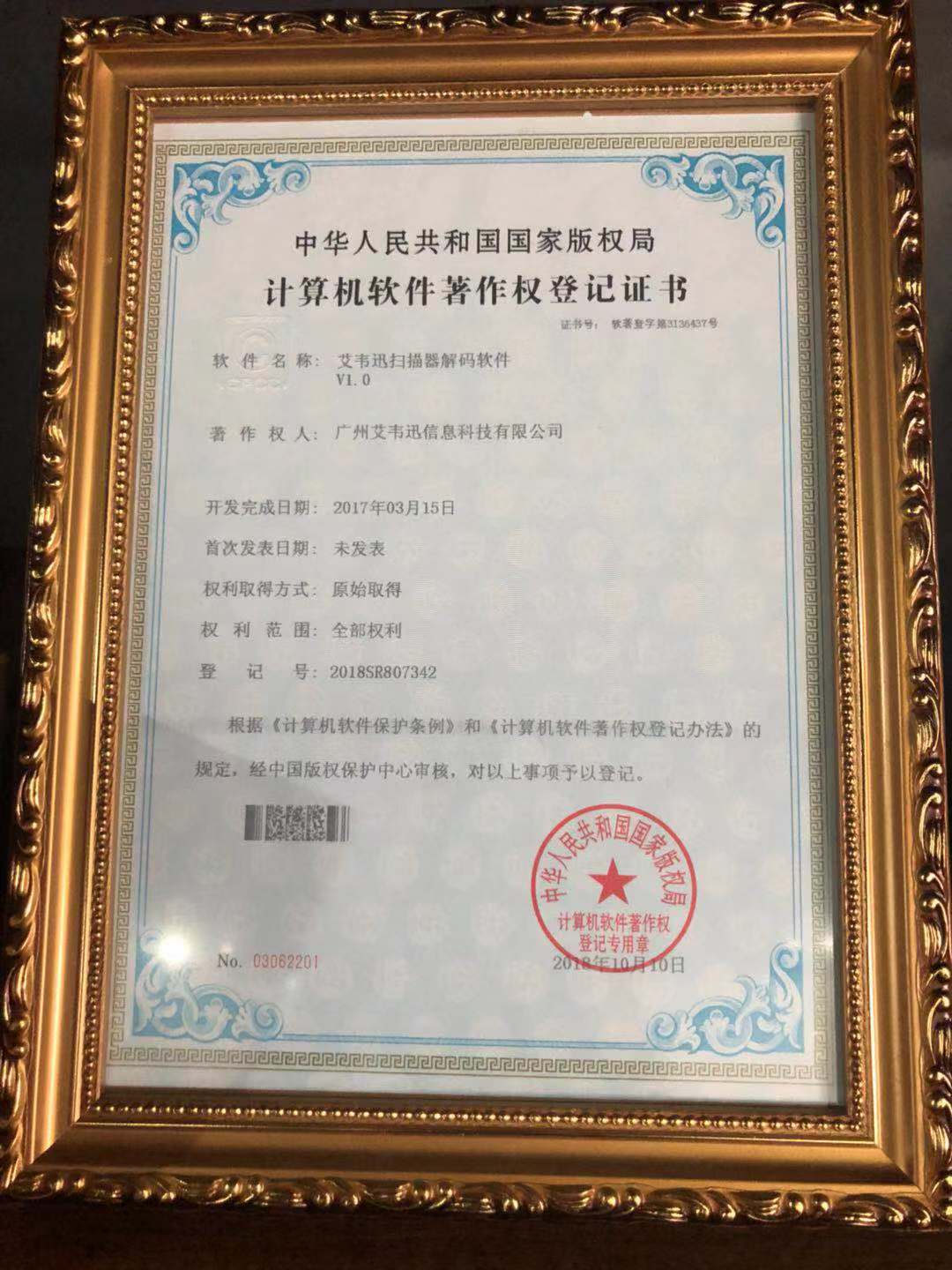 其實,早在2017年3月,經過長期的摸索和應用實踐,艾韋迅完成了“新型掃描器解碼軟件”的研發工作。本次獲得的軟件著作權證書,在我司知識產權工作開展上具有不同凡想的意義,意味著我司通過自主研發取得的獨立知識產權得到了權威的認可和肯定,提升了我司條碼掃描強產品的核心競爭力和行業地位。未來,艾韋迅將再接再厲,緊跟物聯網大產業發展趨勢,不斷為制造業和倉儲物流領域用戶研發與時俱進的新產品和提供創新型服務。